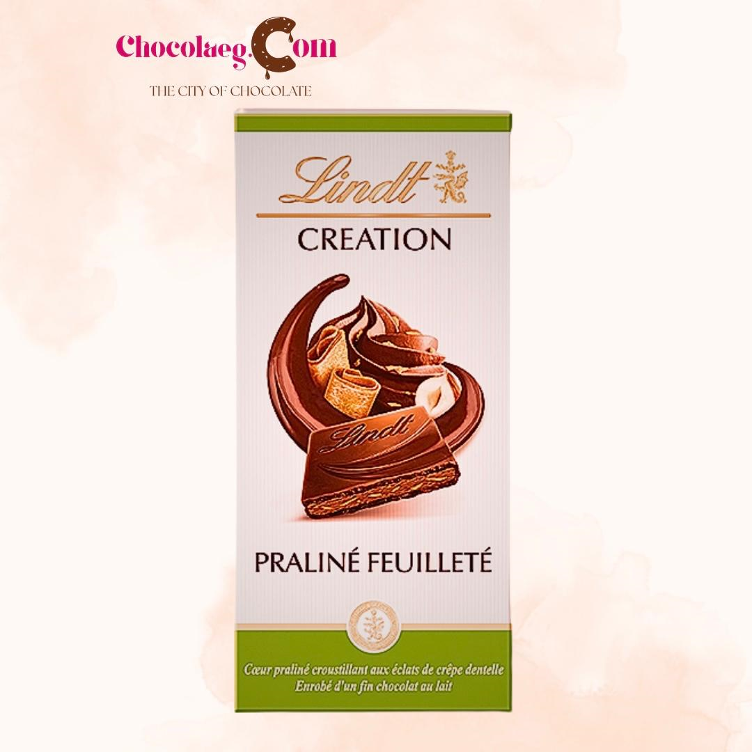 Lindt Creation Praline Feuillete is a milk chocolate bar filled with a creamy hazelnut praline and crispy crepe dentelle pieces
