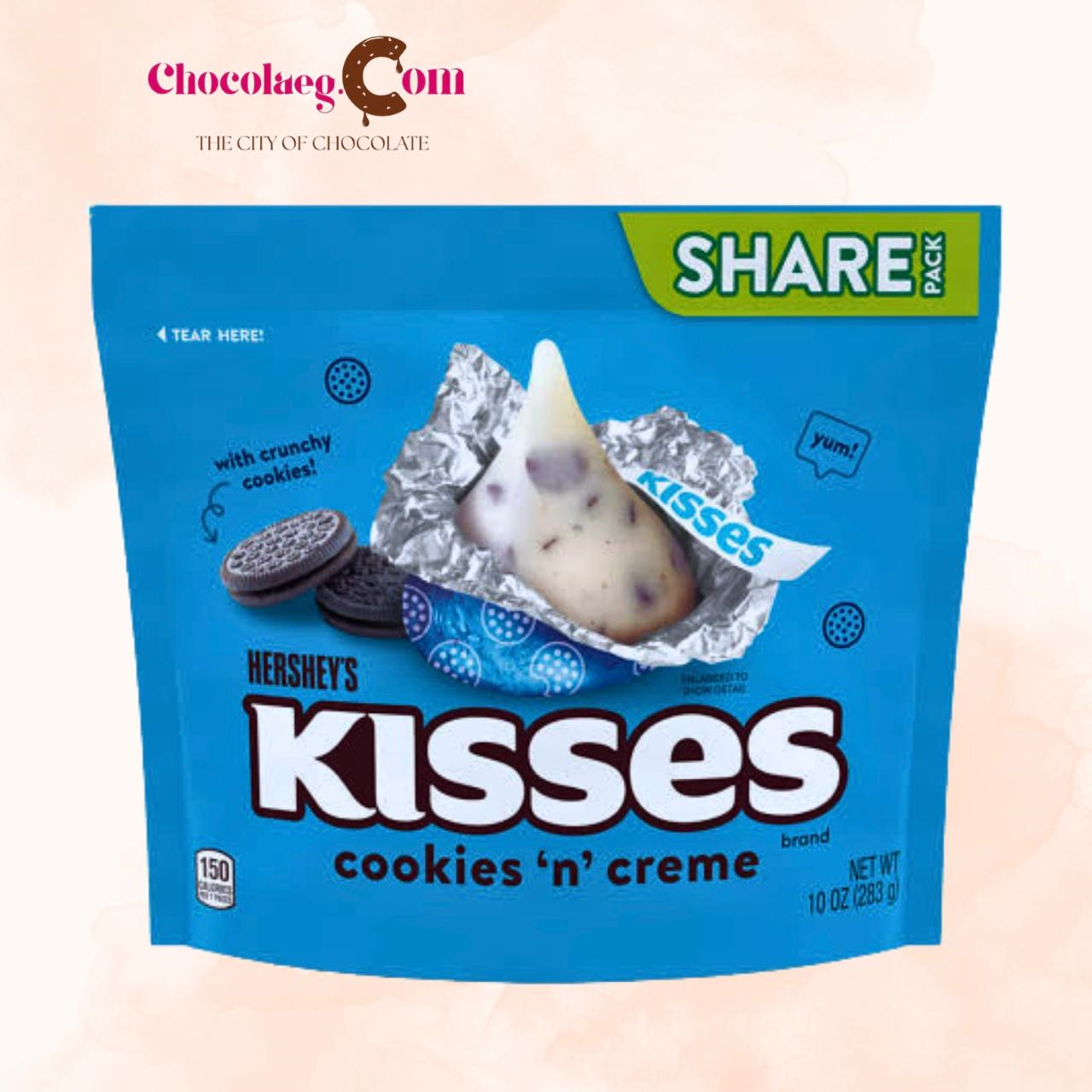 The Hershey’s Kisses Cookies ‘n’ Creme (283g) is a “Share Pack” bag containing individually wrapped, bite-sized white cream candies filled with crunchy chocolate cookie bits. Each 283g bag, is designed for sharing at parties or celebrations and is recognizable by its signature blue foil wrapping.