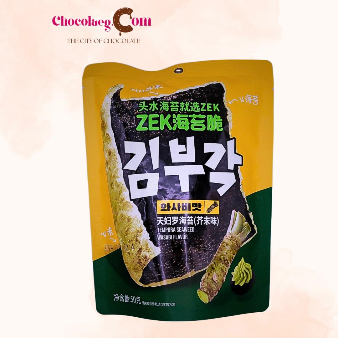 ZEK Tempura Seaweed Snack in Wasabi Flavour is a crispy, savory snack that combines the umami of seaweed with the sharp kick of wasabi. It is made from premium, first-harvest seaweed for a superior texture and taste, and is fried to perfection for an airy crunch.