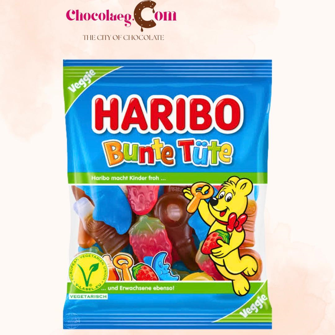 Haribo “Bunte Tüte” (literally “Colorful Bag”) is a popular mix of vegetarian gummy candies that contains well-known Haribo classics like cola bottles and strawberries – 100 gm