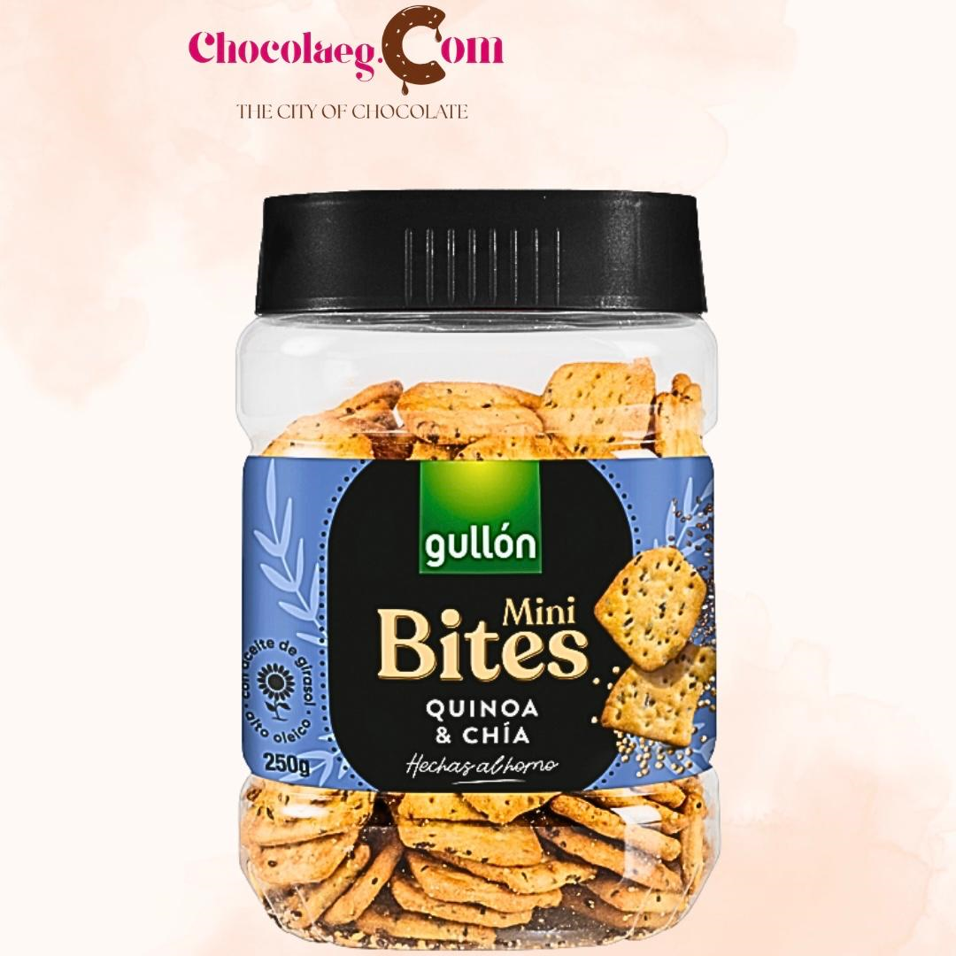 Gullón Mini Bites Quinoa & Chia are a savory, bite-sized cracker made with quinoa and chia seeds. Produced by Spanish company Gullón, they are baked with high-oleic sunflower oil and offer a crispy texture and fiber.