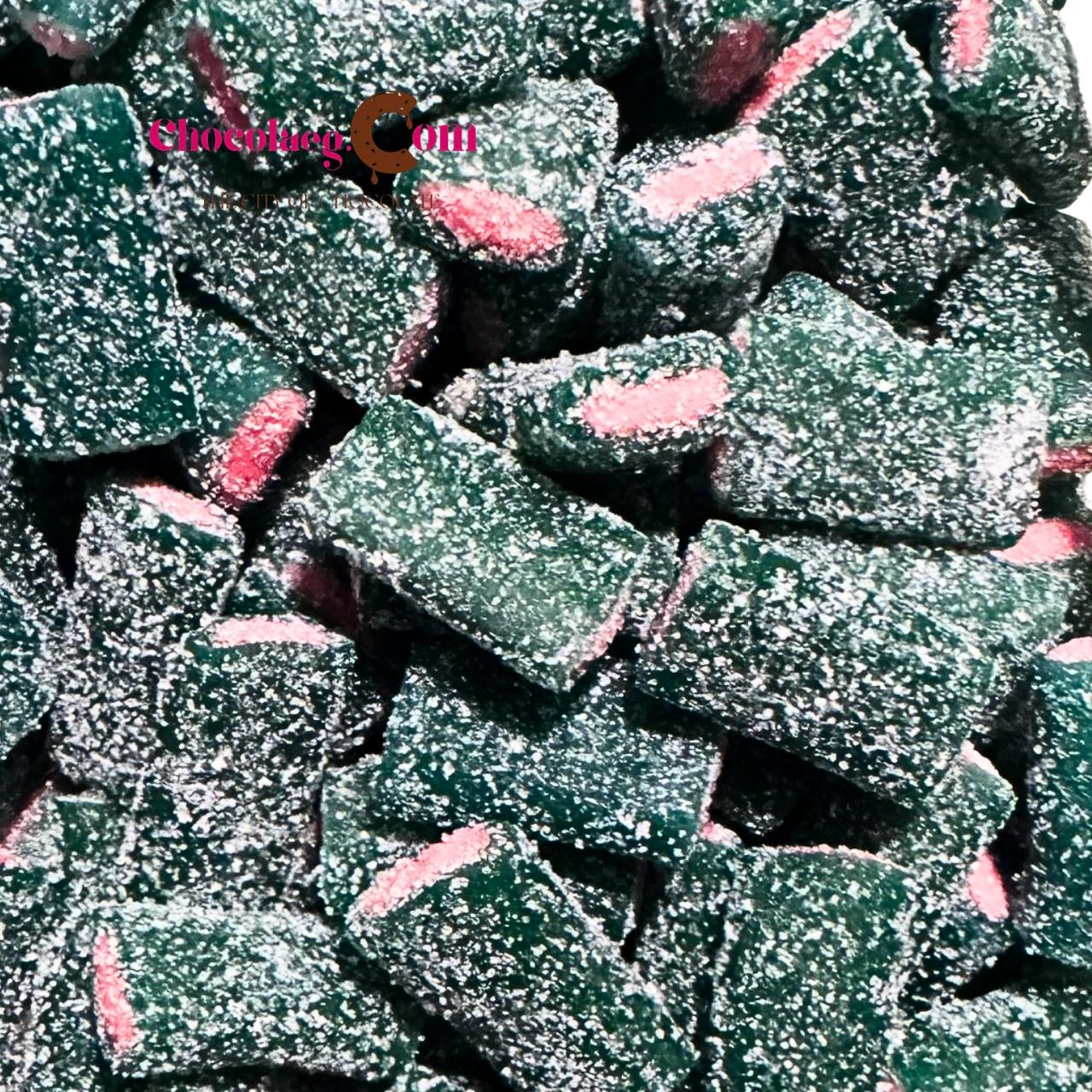sour, sugar-coated gummy candies with a green exterior and a pink center – by kilo