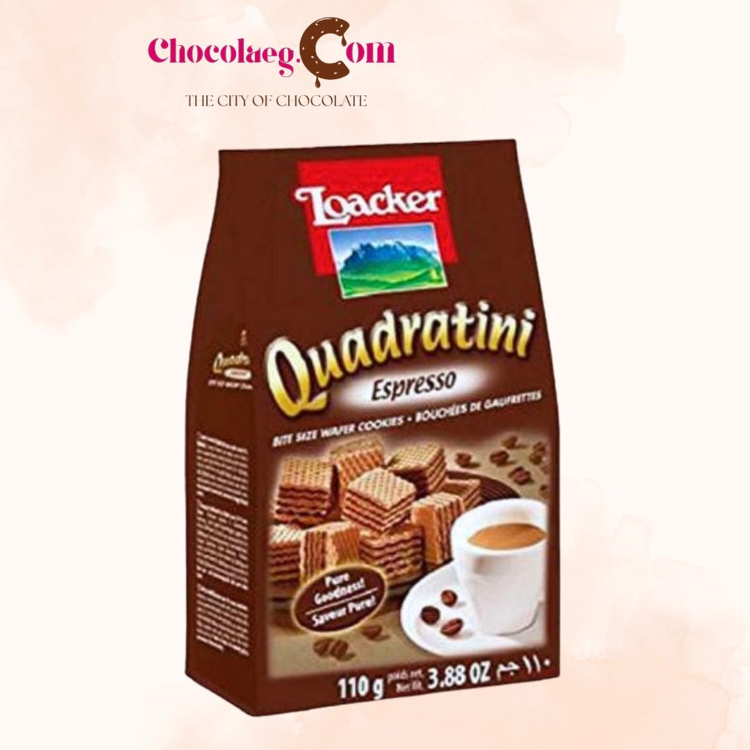 Loacker Quadratini Espresso 110 gm are crispy, cube-shaped wafer cookies with a rich coffee cream filling. They are an Italian product known for their natural ingredients
