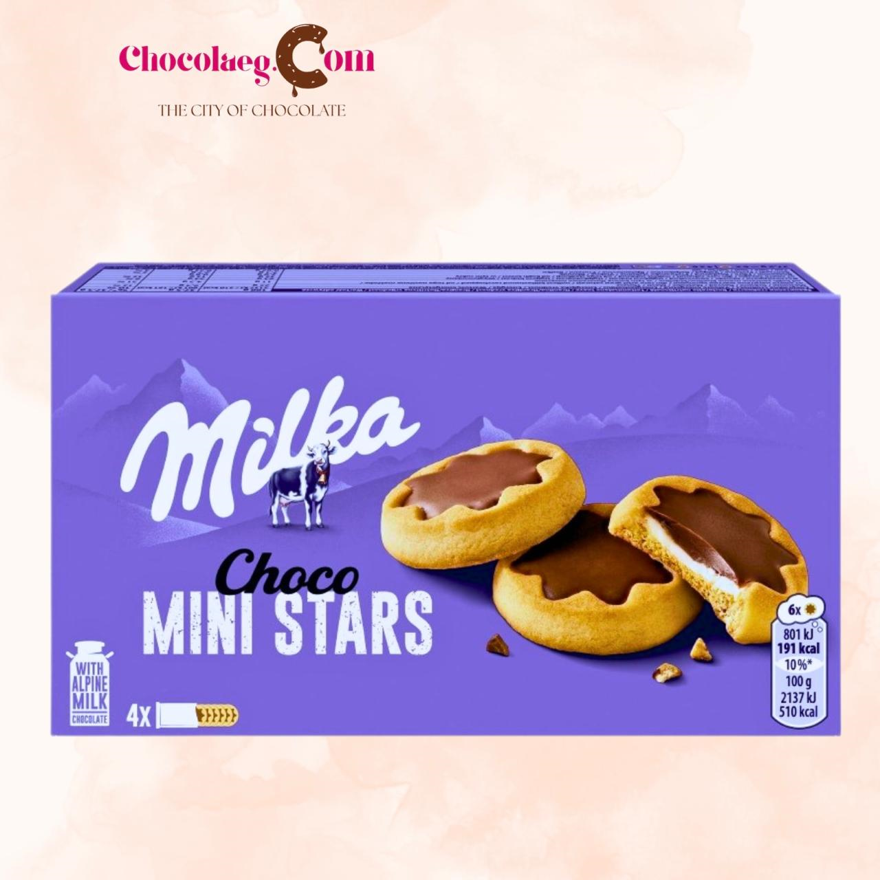 The Milka Choco Mini Stars (150g) are star-shaped mini biscuits featuring a crunchy cocoa or wheat biscuit base, a smooth milk cream filling, and a topping of signature Milka Alpine milk chocolate.