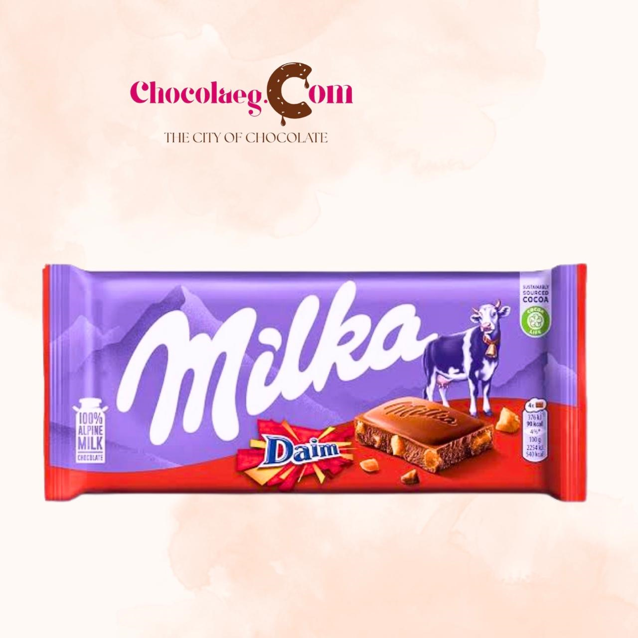 Milka with Daim Chocolate Bar : A standard-sized chocolate bar filled with almond caramel pieces. This is available in sizes such as 100 gm.