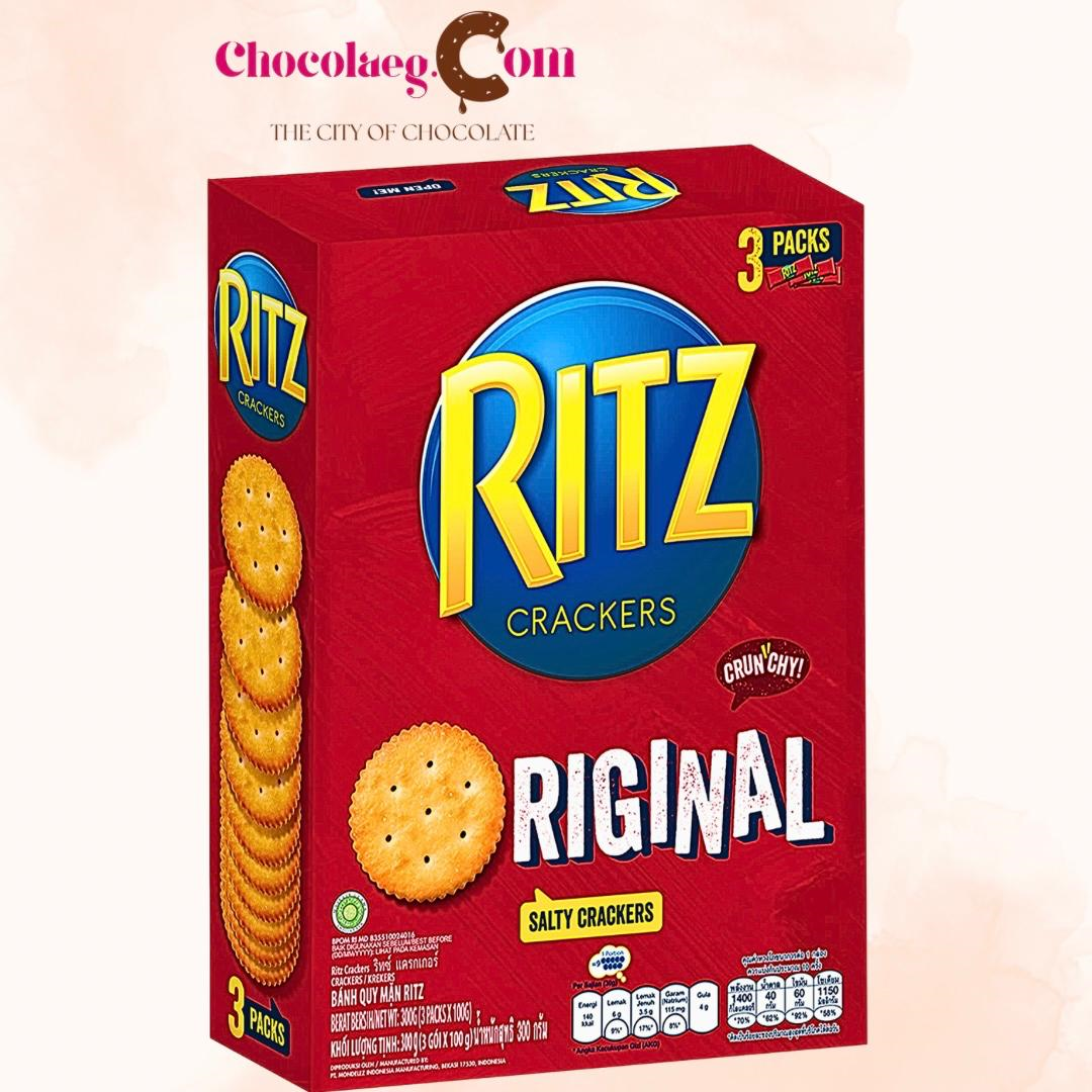 Ritz Crackers Original 300 gm are classic, buttery-flavored, oven-baked crackers that are lightly salted and sold in a box containing three individually wrapped 100g sleeves.