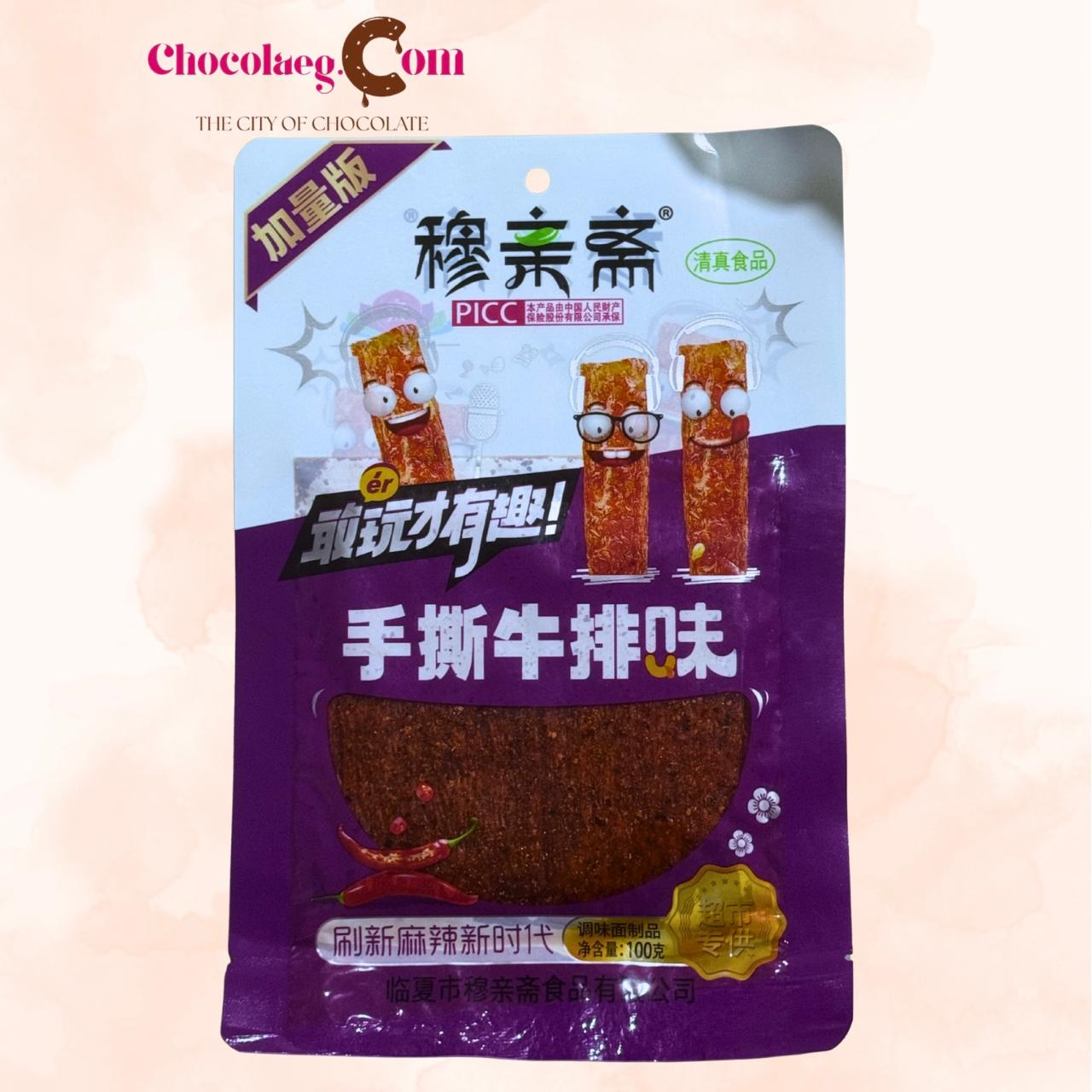 ows Muqinzhai (穆亲斋) Hand-Torn Steak Flavor Spicy Strips, a popular type of “Latiao” (spicy gluten) snack from China. This specific brand is produced by the Linxia Muqinzhai Food Co., Ltd. and is marketed as a halal-friendly product.