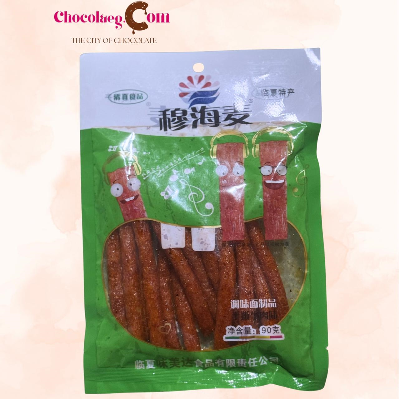 穆海麦 (Muhai Mai) Finger Beef (手指牛肉), a Chinese seasoned pasta product (调味面制品) from the 喜真健品 临夏特产 brand, specializing in delicacies from Linxia. This snack, common in China, is typically made from gluten and flavored to resemble beef, offering a savory and often spicy taste. The package highlights a net weight of 90g and features playful cartoon characters on its vibrant green design.