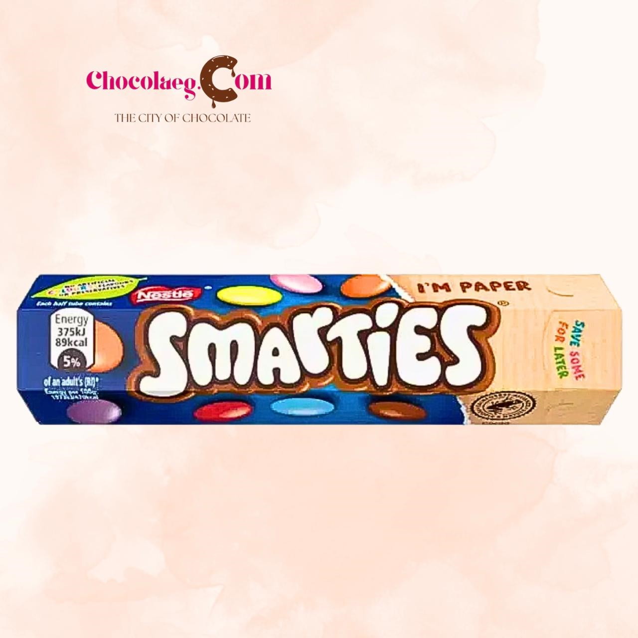Smarties (38g) is a classic tube of colorful, crisp sugar-shelled milk chocolates