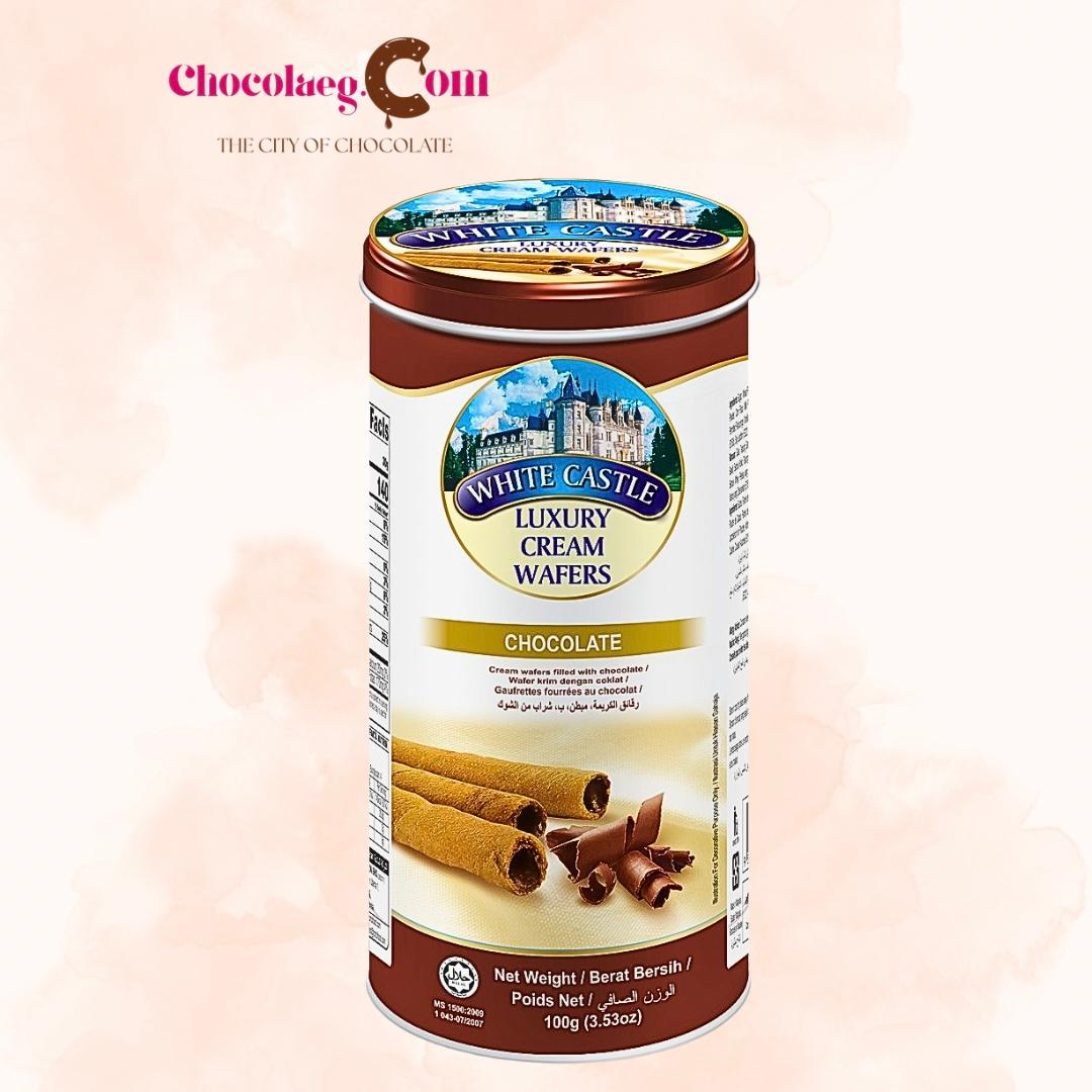 White Castle Luxury Wafer Rolls Chocolate (100g) is a premium Malaysian snack featuring crispy, golden-brown wafer shells filled with rich chocolate cream.