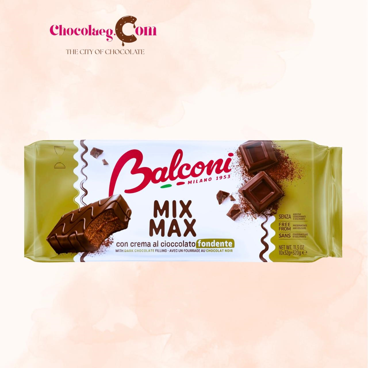 Balconi Mix Max Fondente is an Italian oven-baked sponge cake bar featuring a rich dark chocolate filling and a cocoa coating. Each individual bar weighs 32g, and they are typically sold in packs of 10 (320g total).
